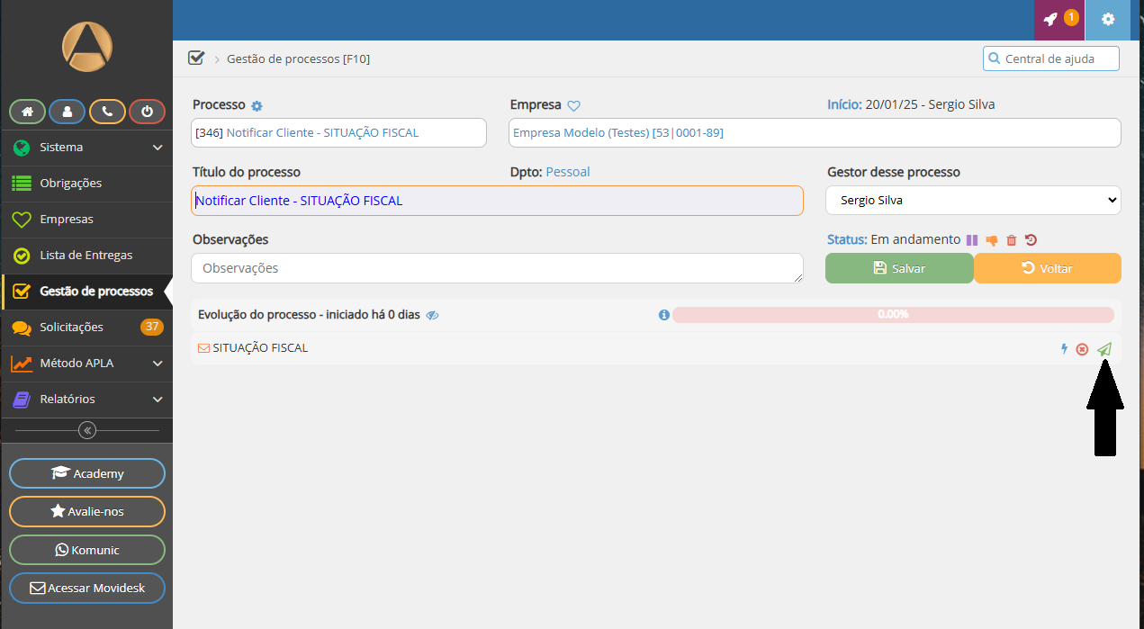 Esse processo garante que o cliente seja devidamente notificado sobre a pendência na situação fiscal. Caso seja necessário, é possível comprovar que a notificação foi enviada ao cliente acessando o prontuário da empresa, onde constam informações como a data de envio, o responsável pelo envio, o destinatário e até mesmo as datas em que o cliente leu o e-mail. Essas informações são fundamentais para assegurar a conformidade com nossas políticas internas.