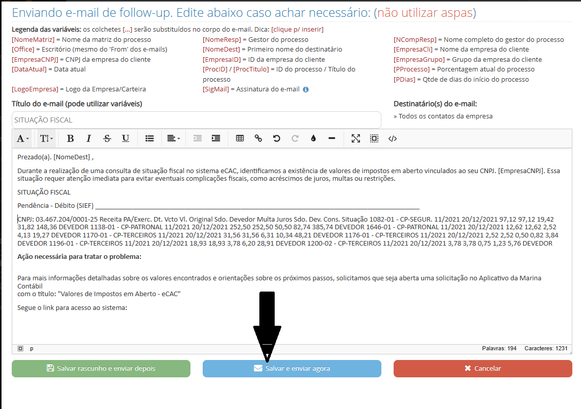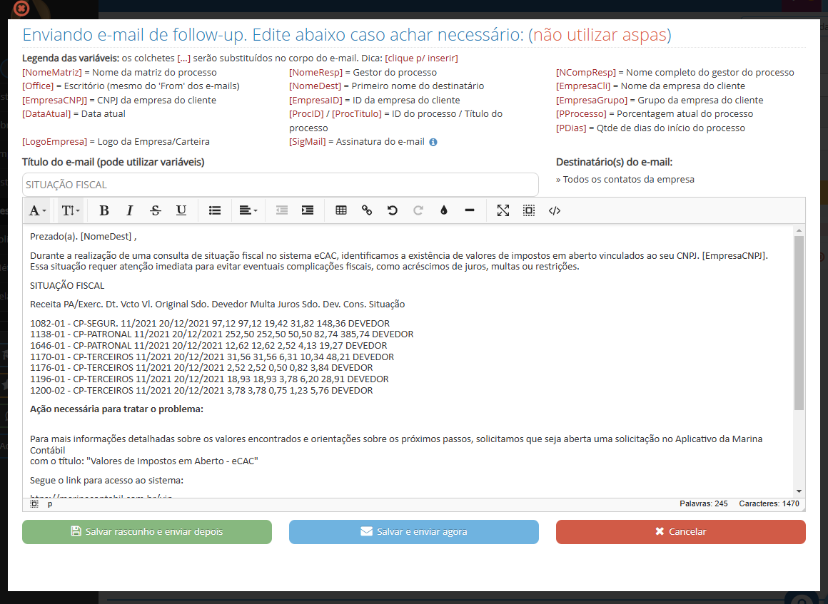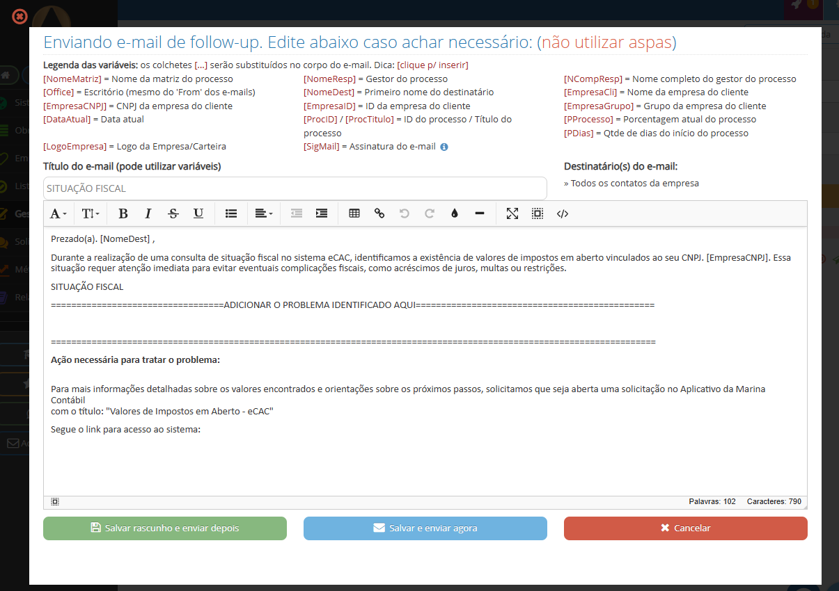Neste momento, abra a situação fiscal, copie o conteúdo que deseja notificar ao cliente e cole no local indicado. Lembre-se de que o conteúdo pode apresentar problemas de formatação; ajuste-o para garantir uma melhor visualização ao cliente.