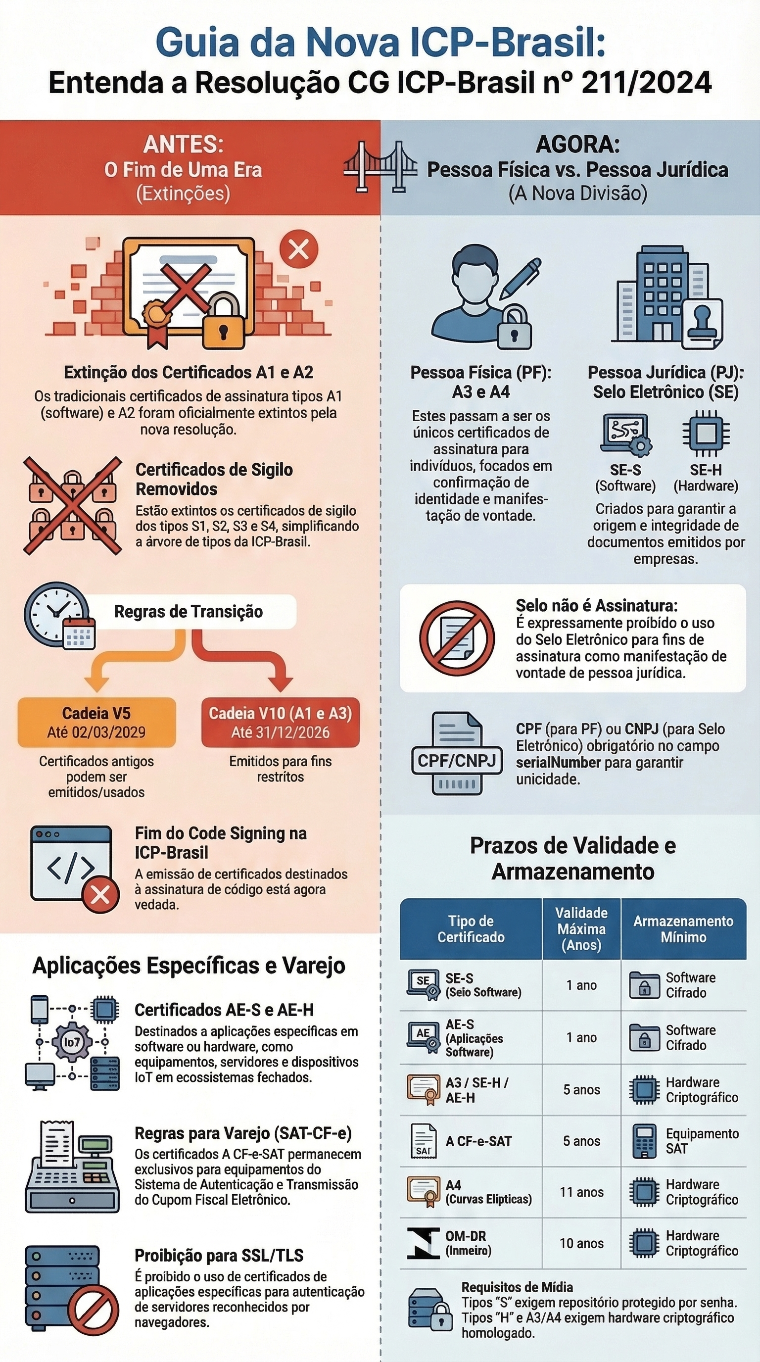 - Prazo de Adaptação: Apesar da extinção, existe um período de transição. Certificados dos tipos A1 e A2 antigos poderão continuar sendo emitidos e utilizados na chamada "cadeia V5" até o dia 02 de março de 2029. Adicionalmente, certificados A1 poderão ser emitidos na "cadeia V10" até 31 de dezembro de 2026 para uso restrito em aplicações específicas.