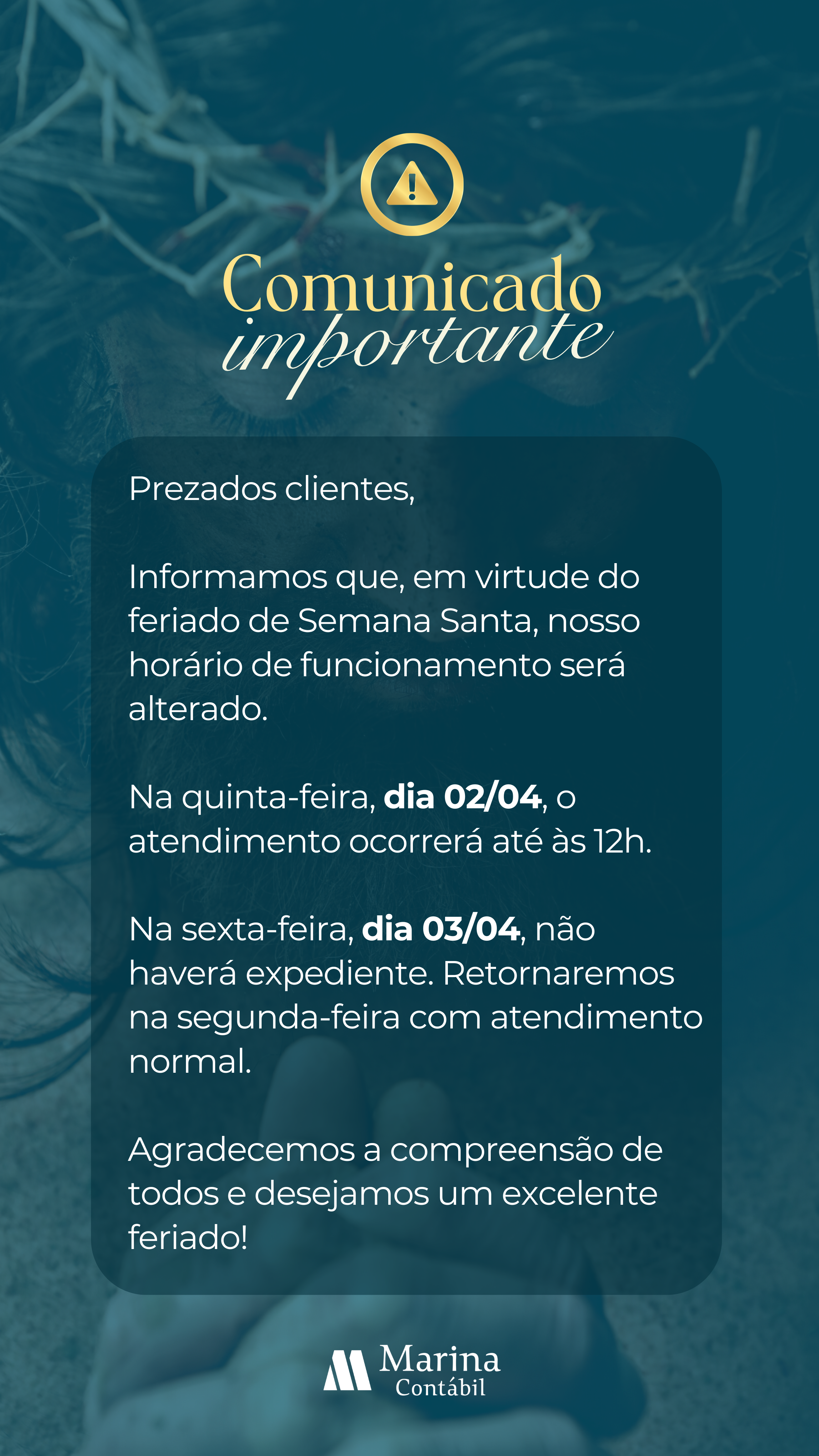 Informamos que, em virtude do feriado de Semana Santa, nosso horário de funcionamento será alterado.