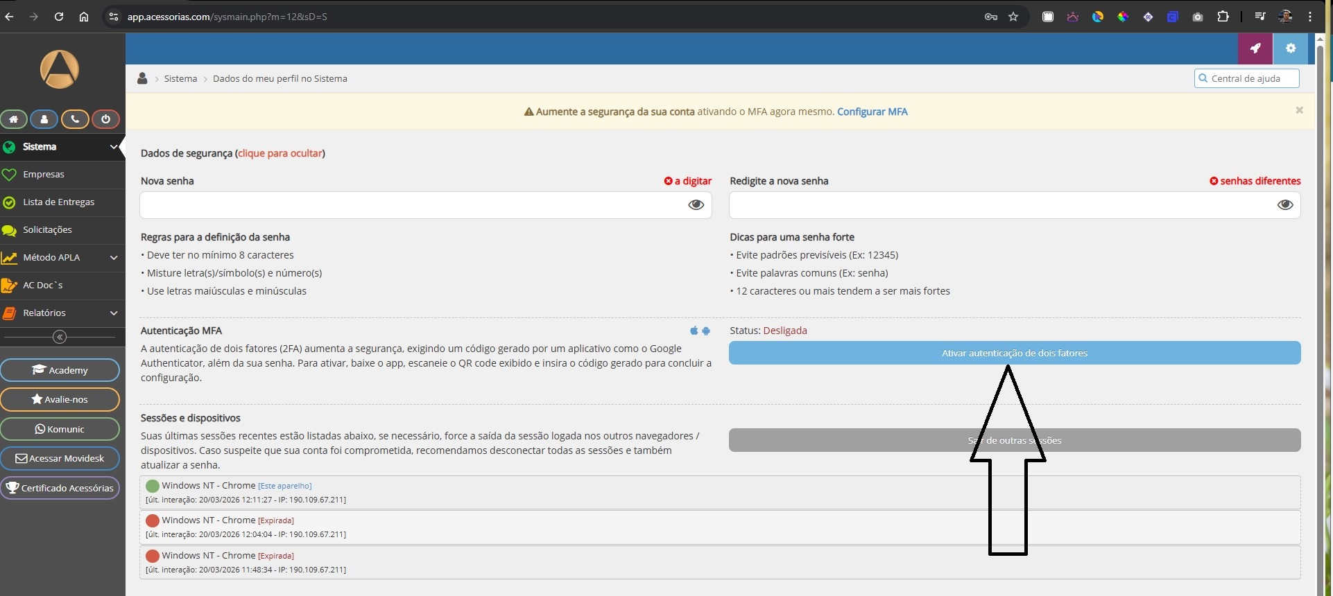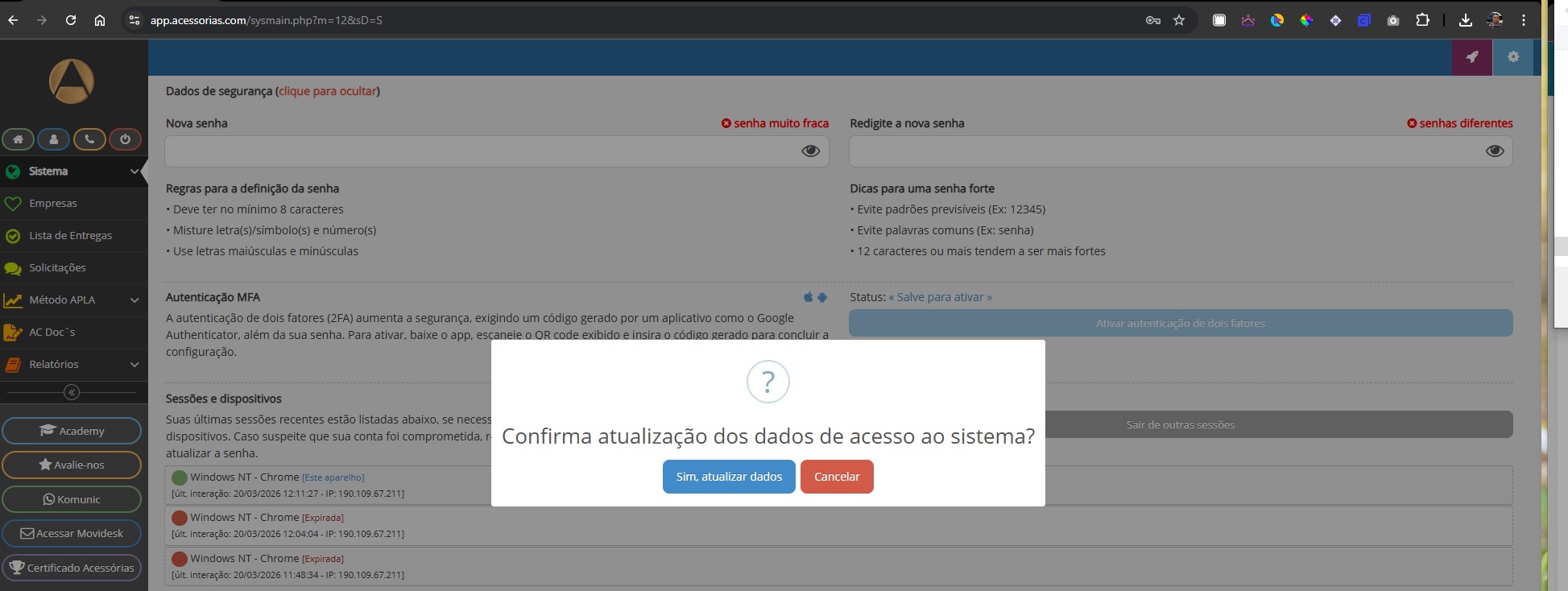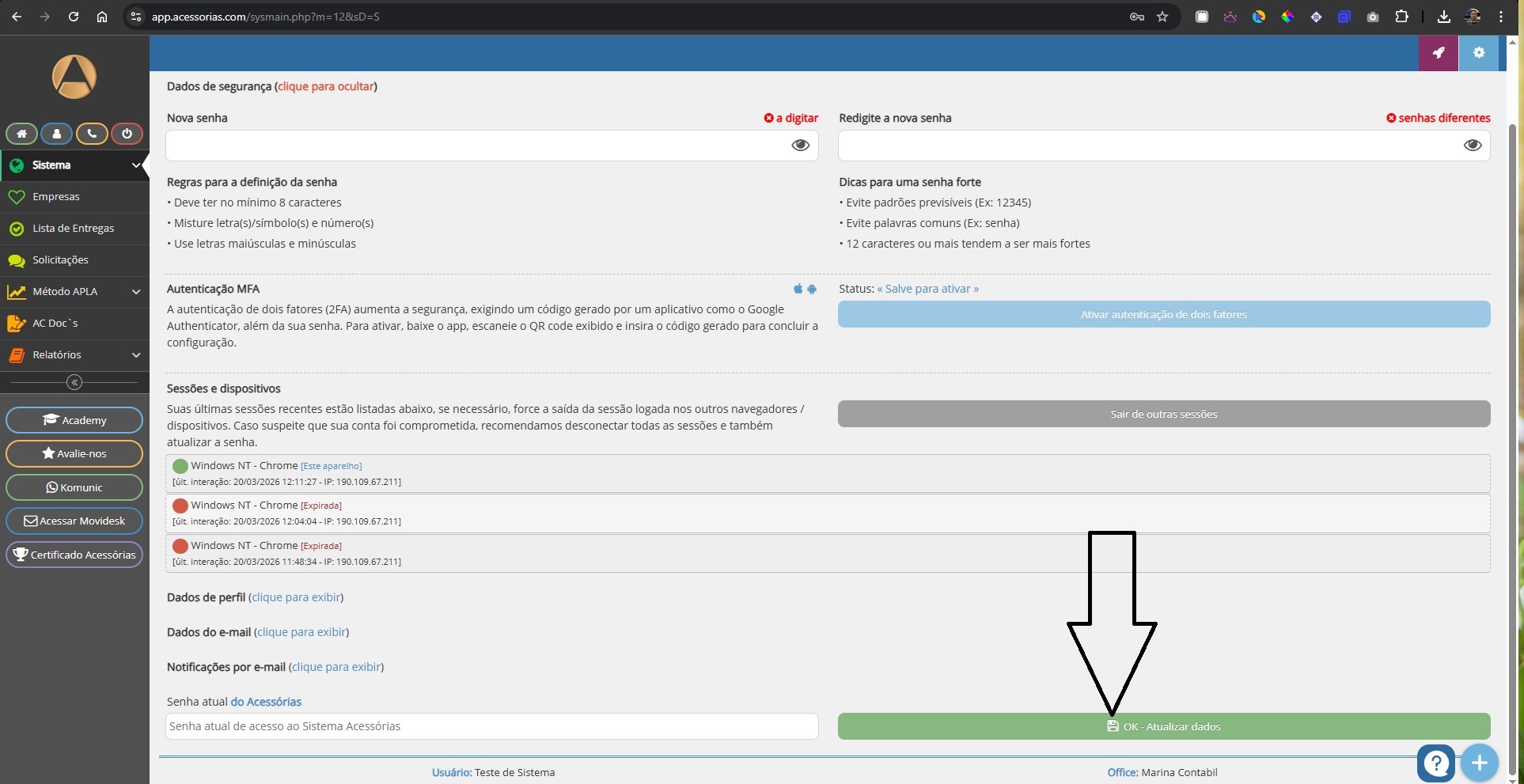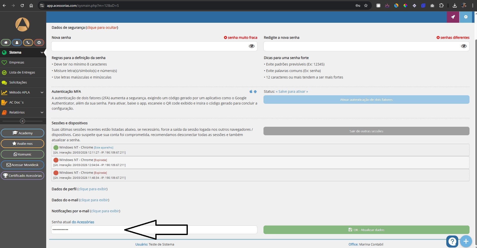 14. Informe sua senha atual do sistema de acessórias no campo indicado na imagem.