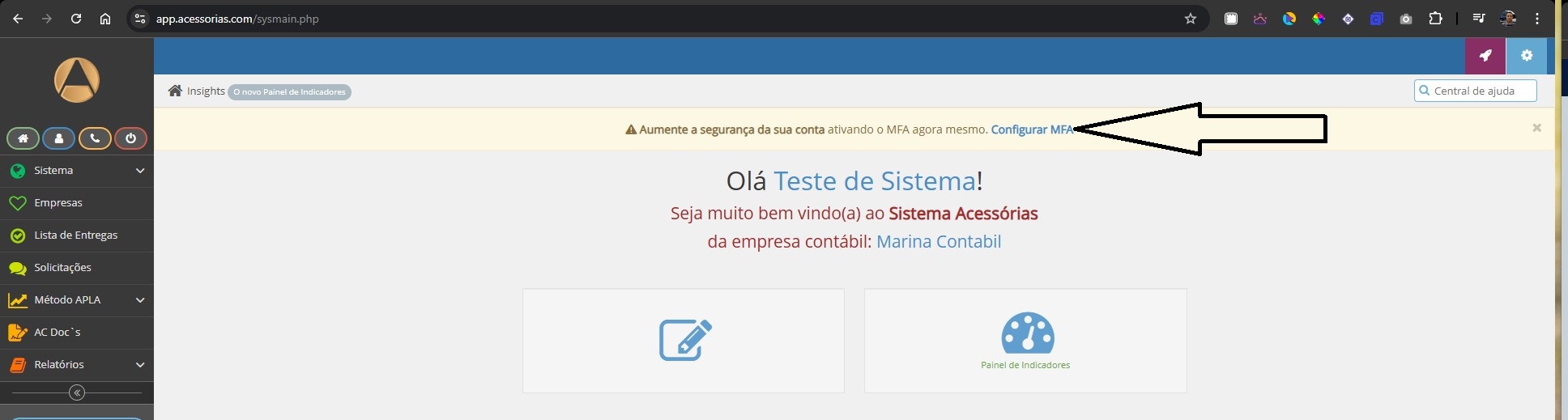 3. Ao acessar a tela inicial, clique na opção “Configurar MFA”.