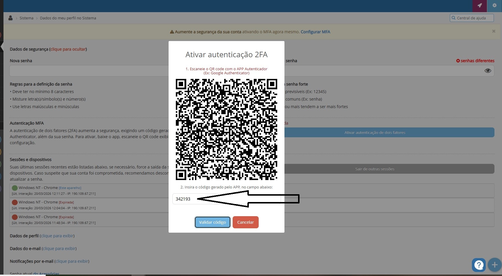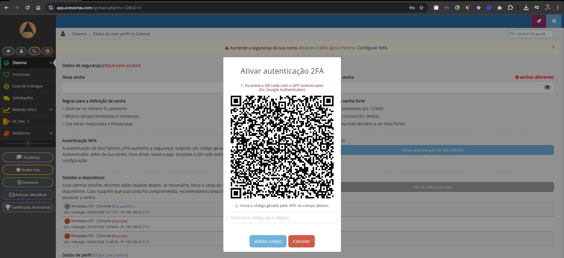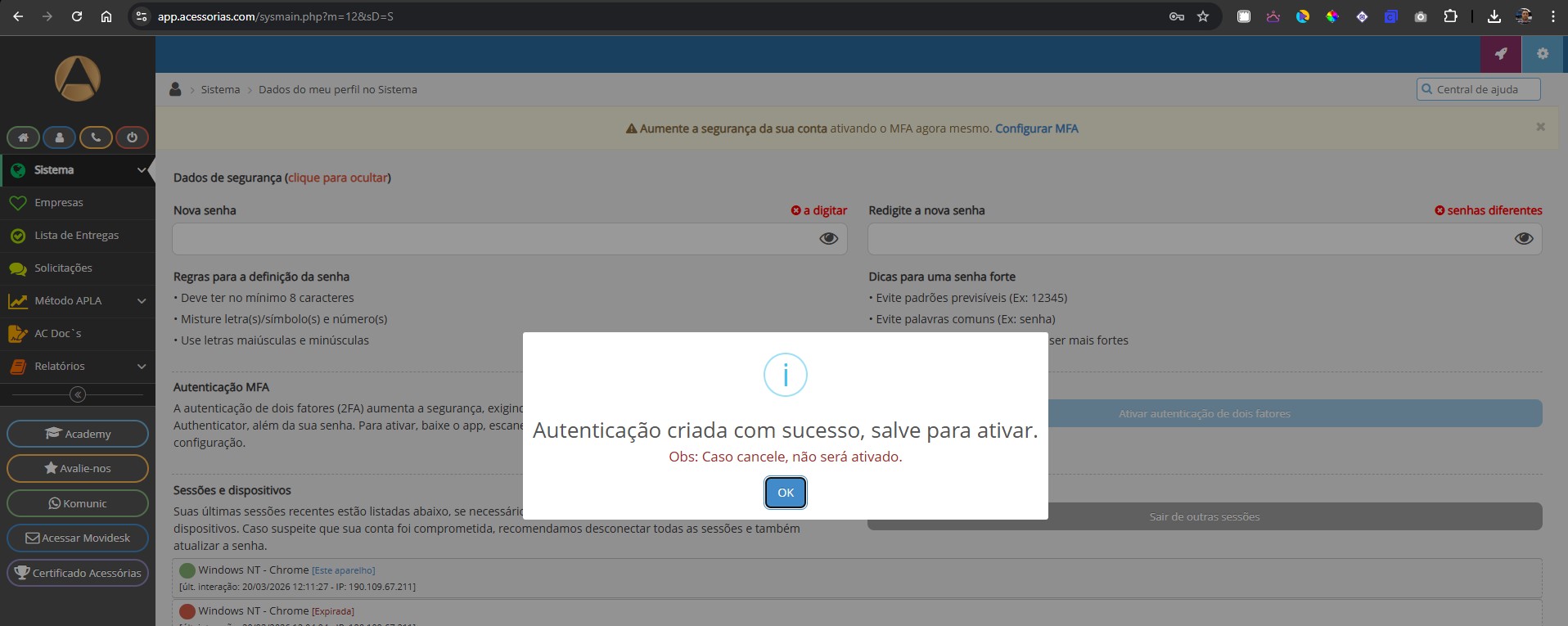 17. Pronto! A autenticação MFA foi ativada com sucesso.