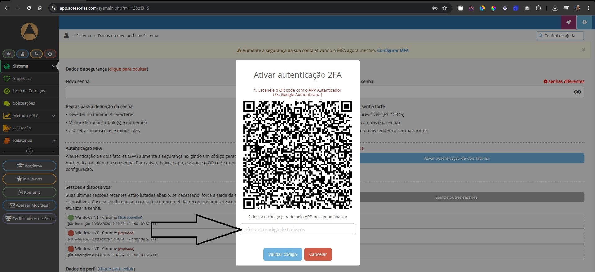 No próximo acesso ao sistema, será necessário abrir o aplicativo autenticador, obter o código de 6 dígitos e informá-lo no sistema para concluir o login.